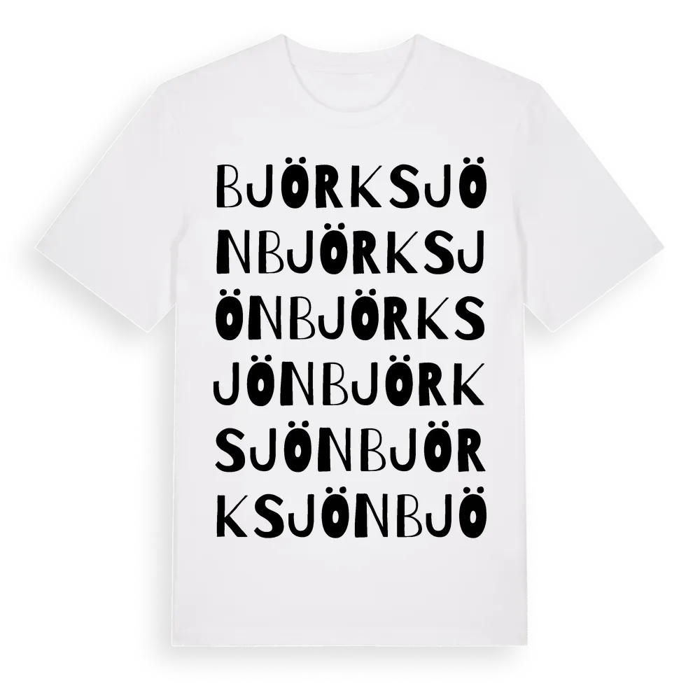 Björksjön ordlek t-shirt är inspirerad av byn Björksjön i Västernorrlands län, Sverige. Tröjan är designad för dig som har en speciell koppling till platsen – oavsett om du bor här, har rötterna här eller bara älskar Björksjön.