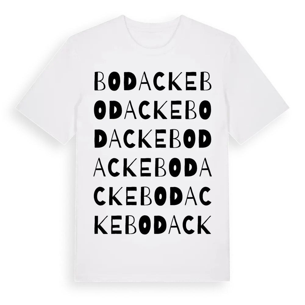Bodacke ordlek t-shirt är inspirerad av byn Bodacke i Västernorrlands län, Sverige. Tröjan är designad för dig som har en speciell koppling till platsen – oavsett om du bor här, har rötterna här eller bara älskar Bodacke.