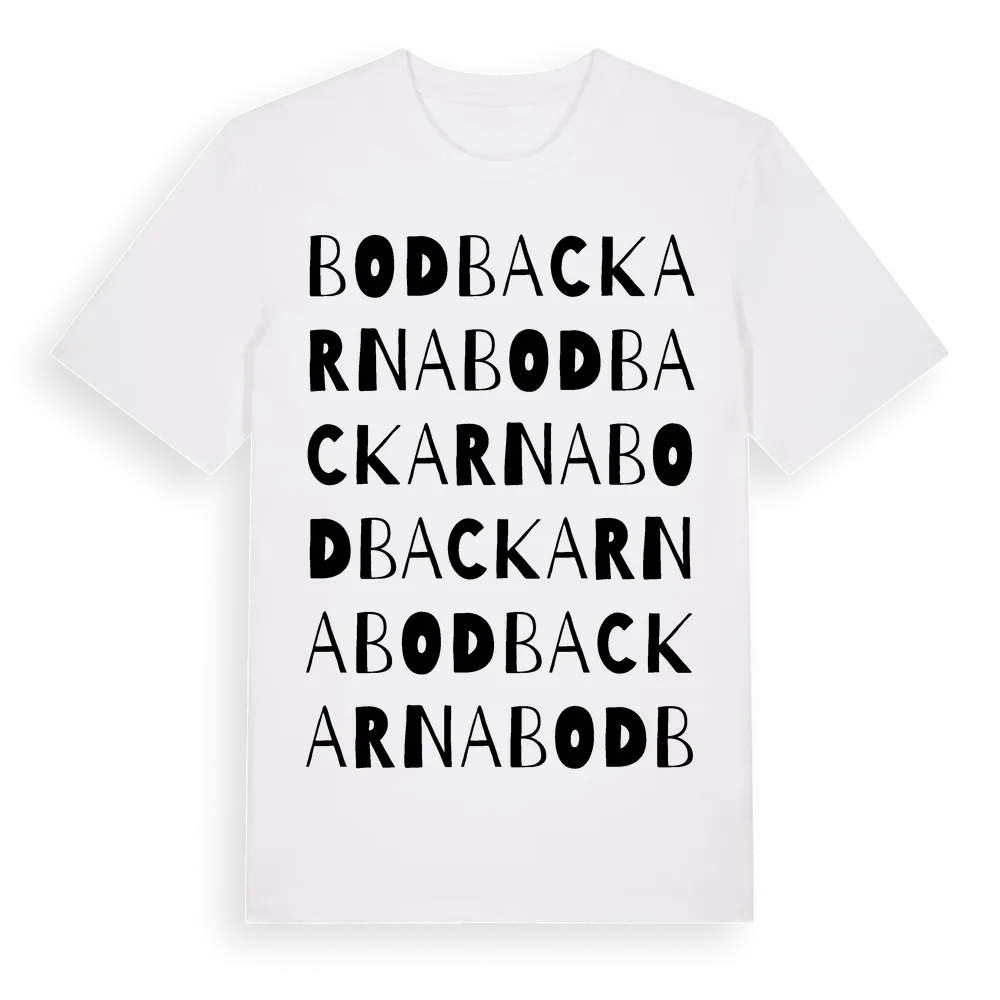 En ordlek byggd på Bodbackarnas namn. Subtilt och klurig – ett motiv som bara de som verkligen känner platsen fullt ut förstår. Premium bomull, unisex – från Bodbackarna i Västernorrlands län.