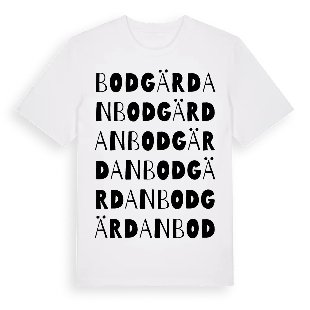 Bodgärdan ordlek t-shirt är inspirerad av Bodgärdan i Västernorrlands län, Sverige. Tröjan är designad för dig som har en speciell koppling till platsen – oavsett om du bor här, har rötterna här eller bara älskar Bodgärdan.