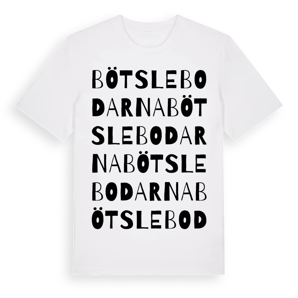 Bötslebodarna ordlek t-shirt är inspirerad av Bötslebodarna i Västernorrlands län, Sverige. Tröjan är designad för dig som har en speciell koppling till platsen – oavsett om du bor här, har rötterna här eller bara älskar Bötslebodarna.