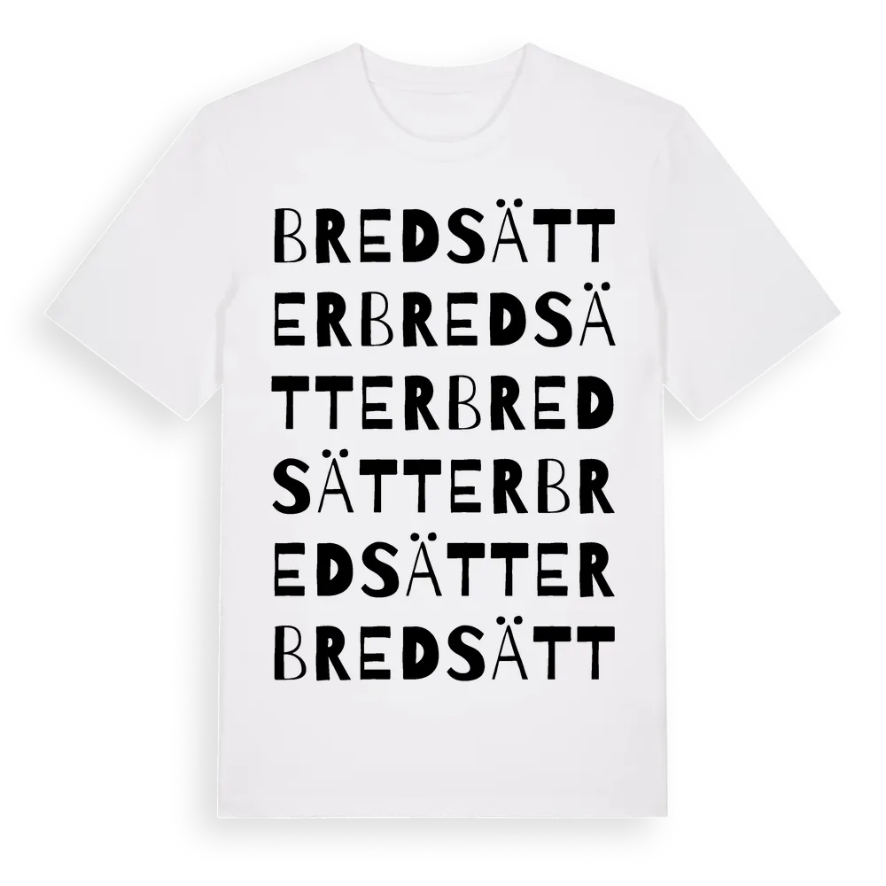 Bredsätter ordlek t-shirt är inspirerad av byn Bredsätter i Västernorrlands län, Sverige. Tröjan är designad för dig som har en speciell koppling till platsen – oavsett om du bor här, har rötterna här eller bara älskar Bredsätter.