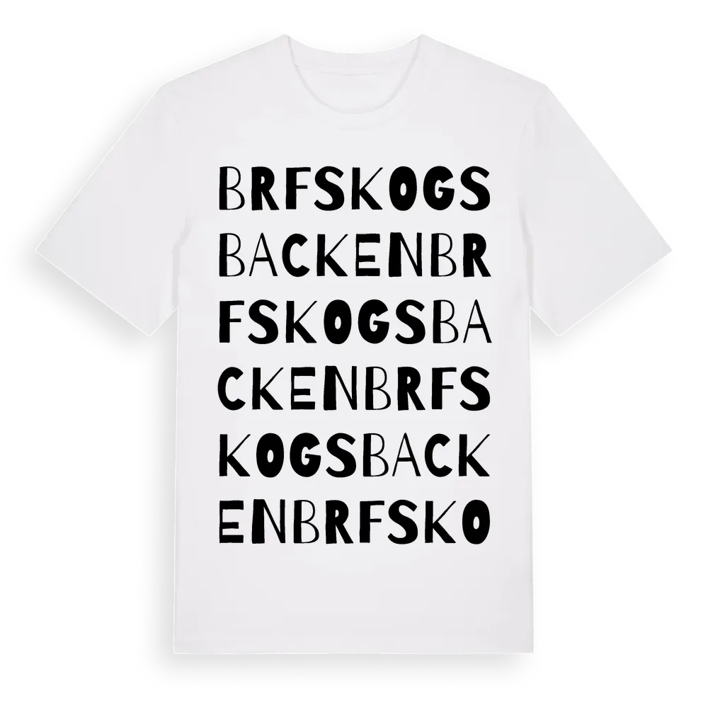 Brf Skogsbacken ordlek t-shirt är inspirerad av stadsdelen Brf Skogsbacken i Västernorrlands län, Sverige. Tröjan är designad för dig som har en speciell koppling till platsen – oavsett om du bor här, har rötterna här eller bara älskar Brf Skogsbacken.