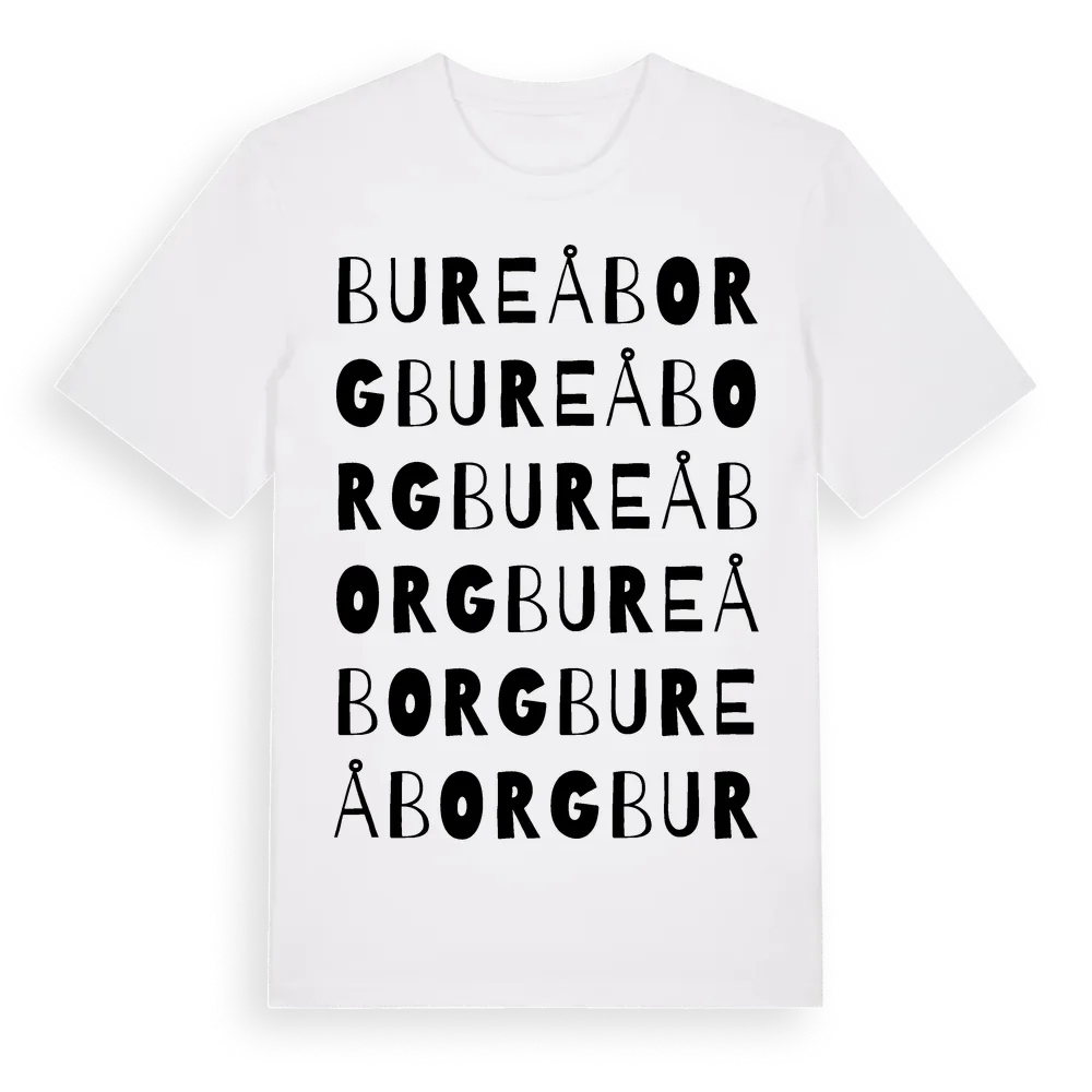 Bureåborg ordlek t-shirt är inspirerad av byn Bureåborg i Västernorrlands län, Sverige. Tröjan är designad för dig som har en speciell koppling till platsen – oavsett om du bor här, har rötterna här eller bara älskar Bureåborg.