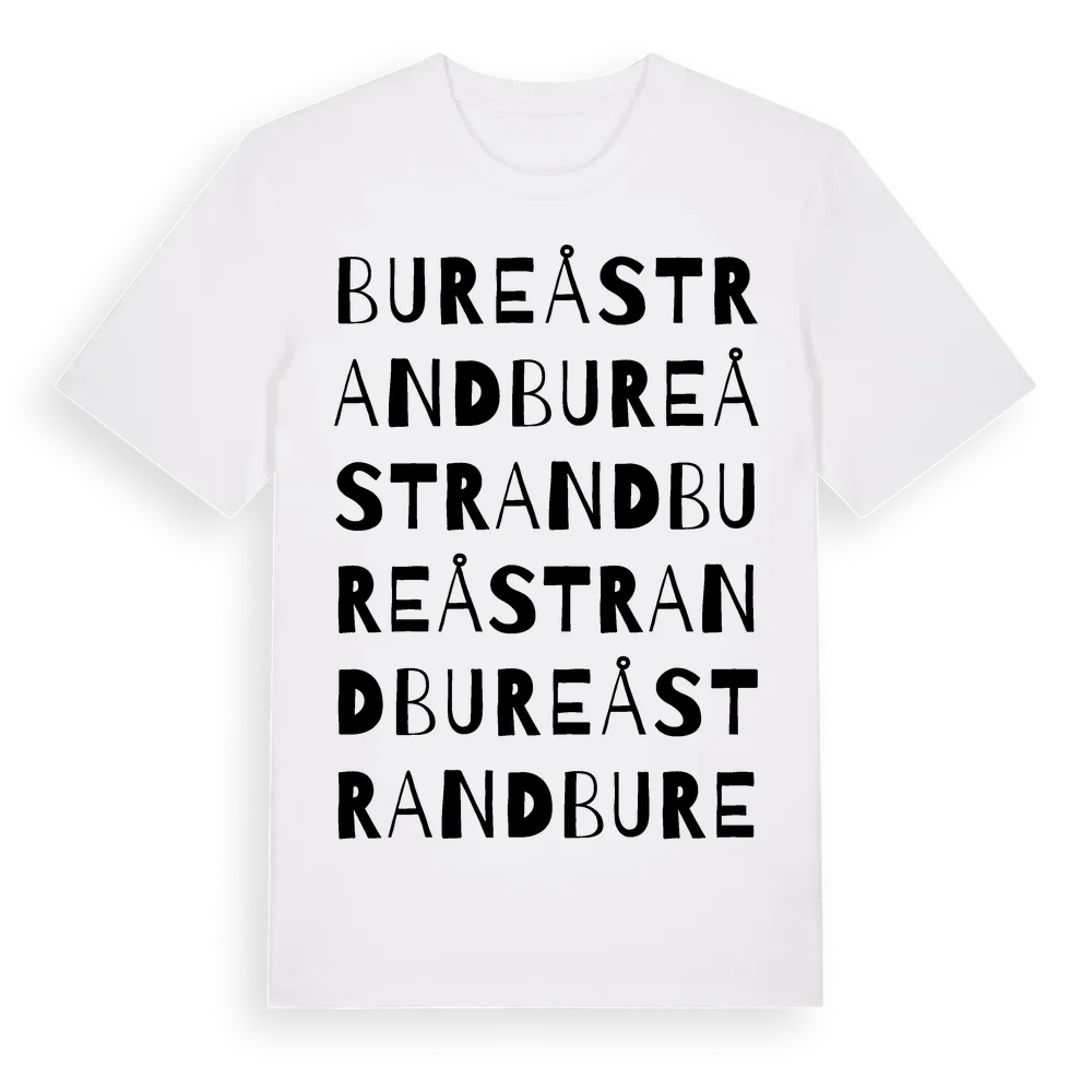 Bureåstrand ordlek t-shirt är inspirerad av byn Bureåstrand i Västernorrlands län, Sverige. Tröjan är designad för dig som har en speciell koppling till platsen – oavsett om du bor här, har rötterna här eller bara älskar Bureåstrand.