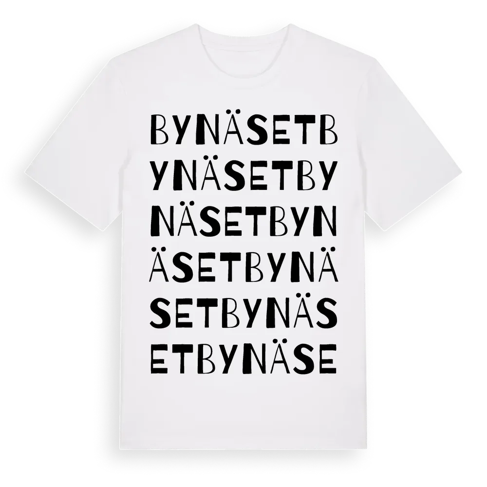 Bynäset ordlek t-shirt är inspirerad av byn Bynäset i Västernorrlands län, Sverige. Tröjan är designad för dig som har en speciell koppling till platsen – oavsett om du bor här, har rötterna här eller bara älskar Bynäset.