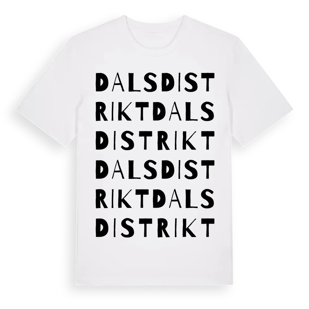 Dals Distrikt ordlek t-shirt är inspirerad av Dals Distrikt i Västernorrlands län, Sverige. Tröjan är designad för dig som har en speciell koppling till platsen – oavsett om du bor här, har rötterna här eller bara älskar Dals Distrikt.