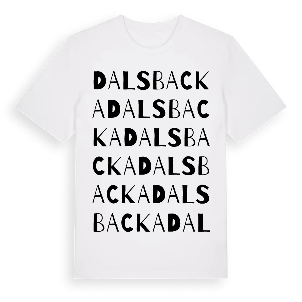 Dalsbacka ordlek t-shirt är inspirerad av Dalsbacka i Västernorrlands län, Sverige. Tröjan är designad för dig som har en speciell koppling till platsen – oavsett om du bor här, har rötterna här eller bara älskar Dalsbacka.