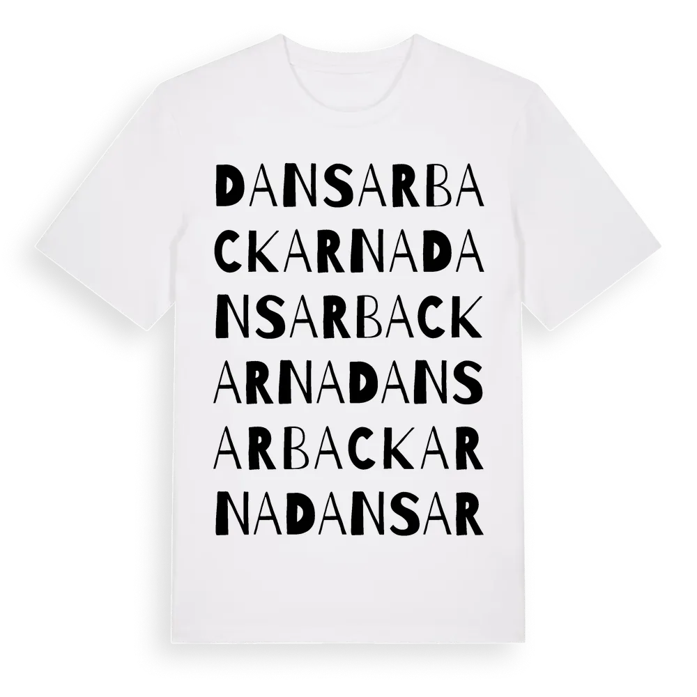 En ordlek byggd på Dansarbackarnas namn. Subtilt och klurig – ett motiv som bara de som verkligen känner platsen fullt ut förstår. Premium bomull, unisex – från Dansarbackarna i Västernorrlands län.