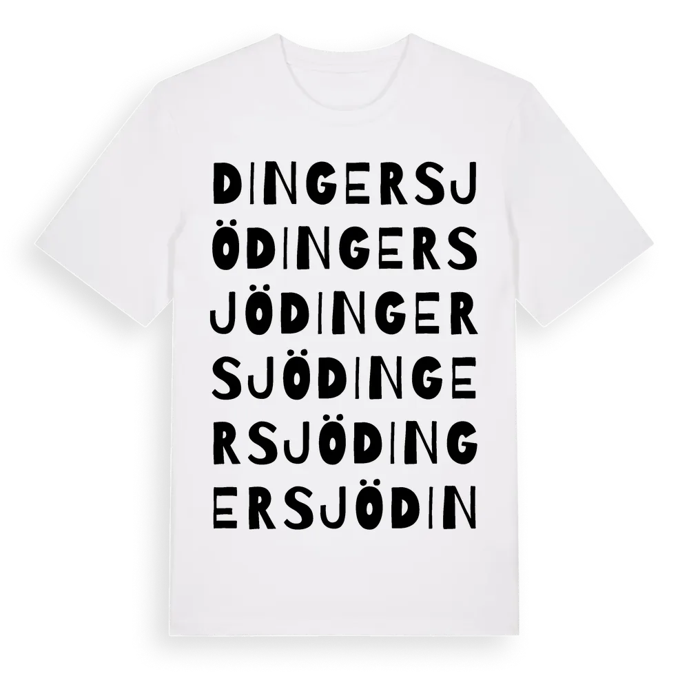Dingersjö ordlek t-shirt är inspirerad av byn Dingersjö i Västernorrlands län, Sverige. Tröjan är designad för dig som har en speciell koppling till platsen – oavsett om du bor här, har rötterna här eller bara älskar Dingersjö.
