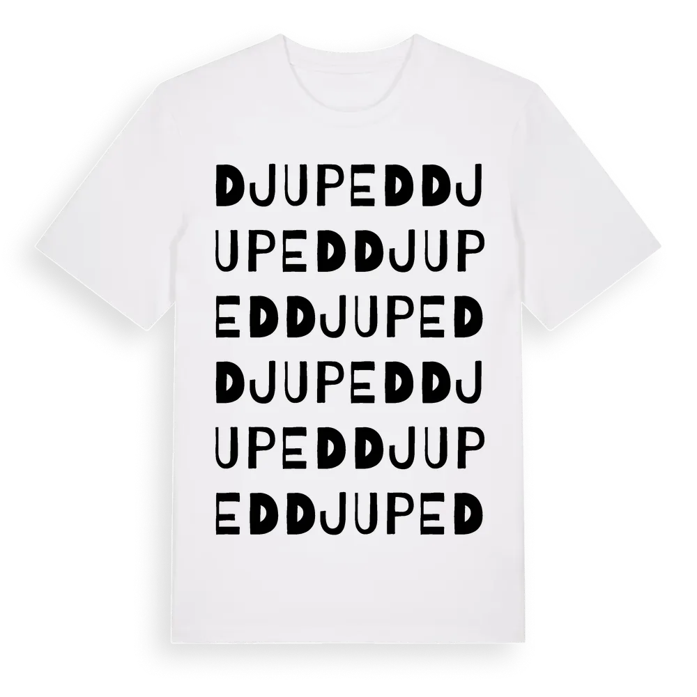 Djuped ordlek t-shirt är inspirerad av byn Djuped i Västernorrlands län, Sverige. Tröjan är designad för dig som har en speciell koppling till platsen – oavsett om du bor här, har rötterna här eller bara älskar Djuped.