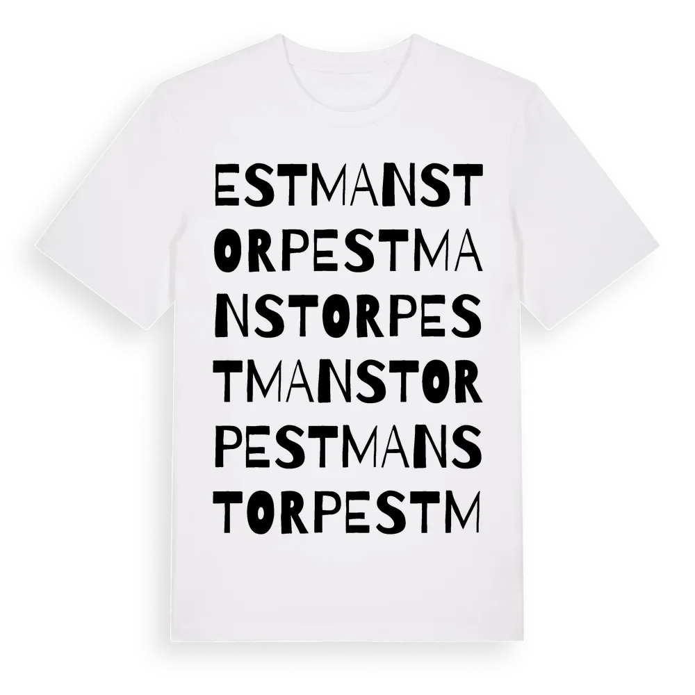 Estmanstorp ordlek t-shirt är inspirerad av byn Estmanstorp i Västernorrlands län, Sverige. Tröjan är designad för dig som har en speciell koppling till platsen – oavsett om du bor här, har rötterna här eller bara älskar Estmanstorp.