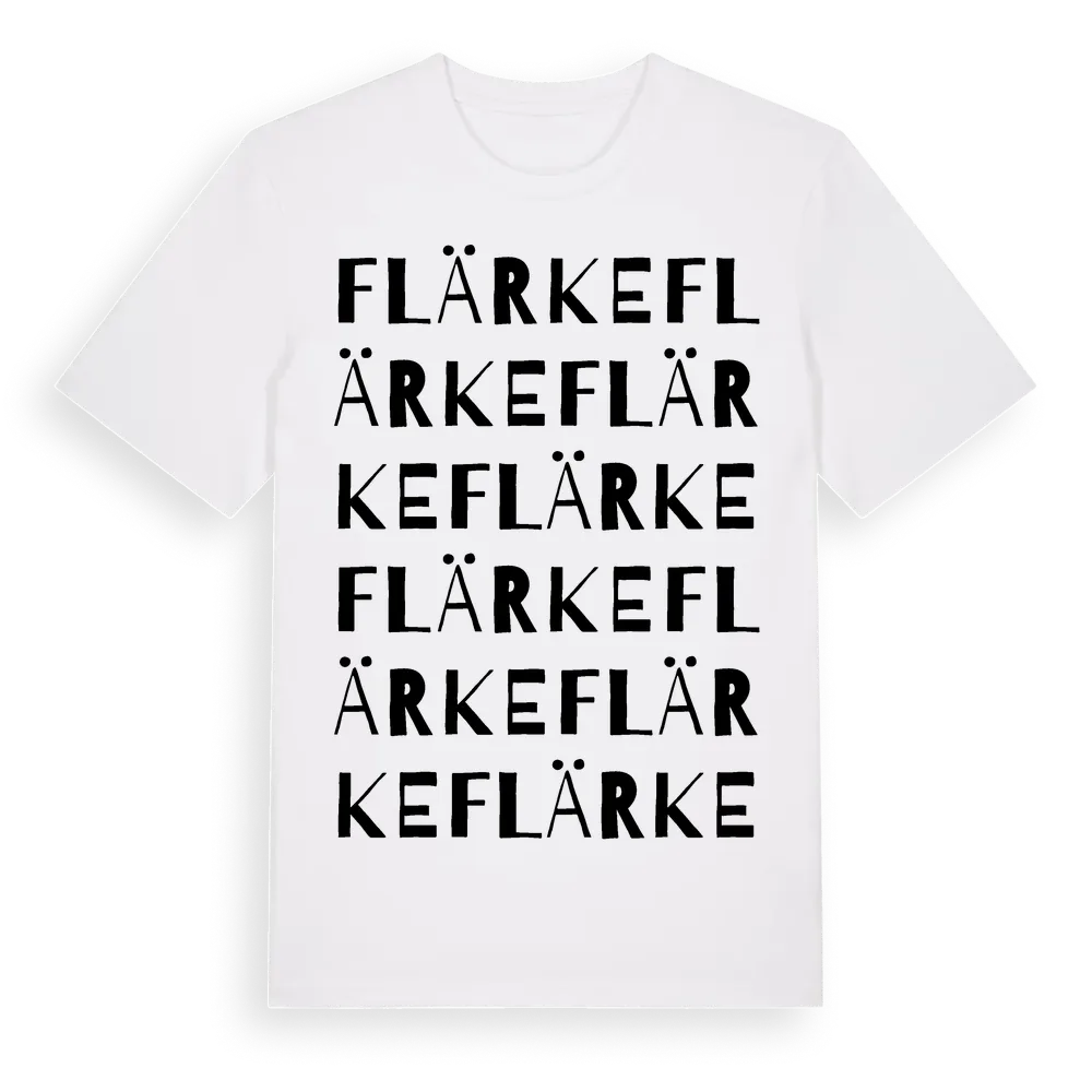 Flärke ordlek t-shirt är inspirerad av byn Flärke i Västernorrlands län, Sverige. Tröjan är designad för dig som har en speciell koppling till platsen – oavsett om du bor här, har rötterna här eller bara älskar Flärke.