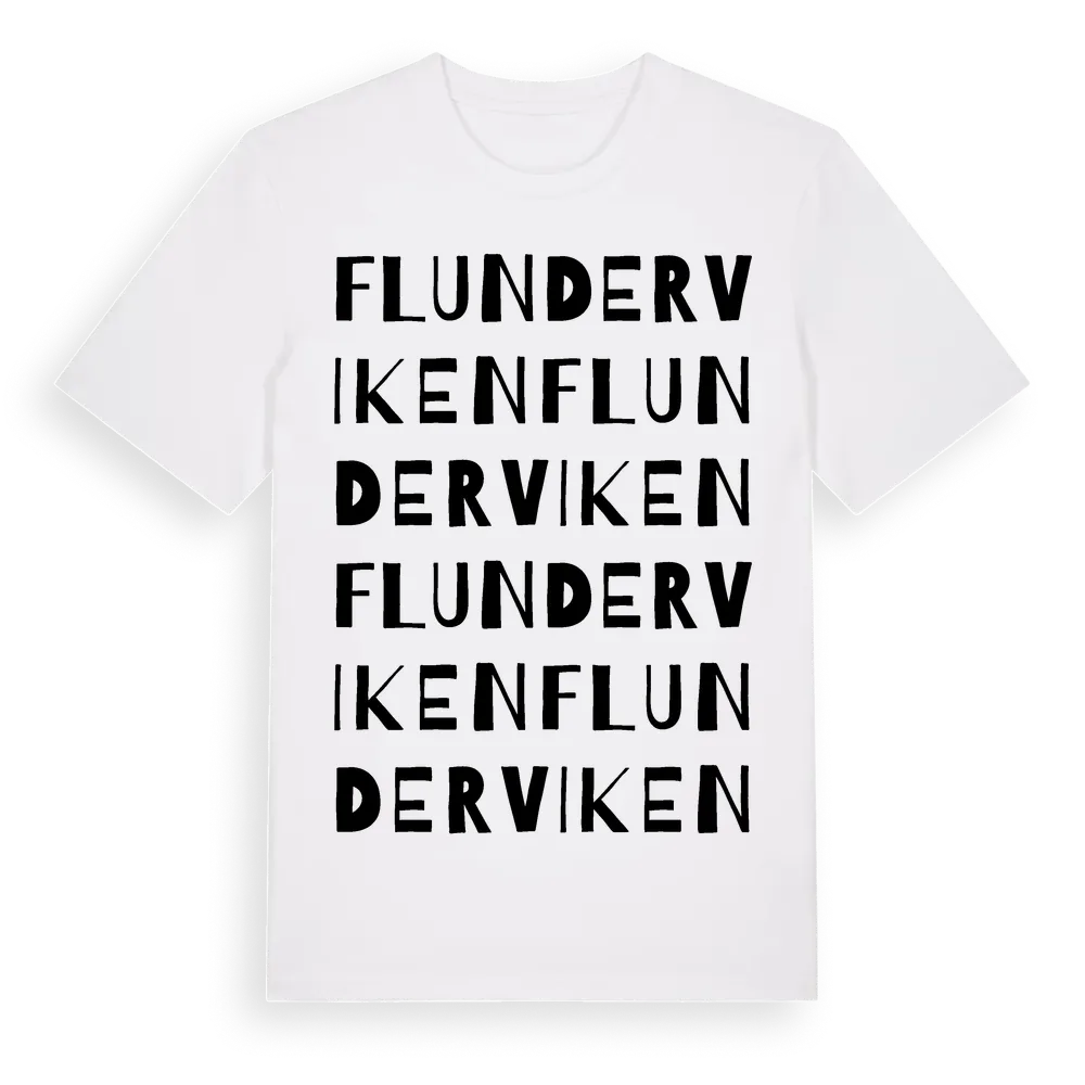 Flunderviken ordlek t-shirt är inspirerad av Flunderviken i Västernorrlands län, Sverige. Tröjan är designad för dig som har en speciell koppling till platsen – oavsett om du bor här, har rötterna här eller bara älskar Flunderviken.