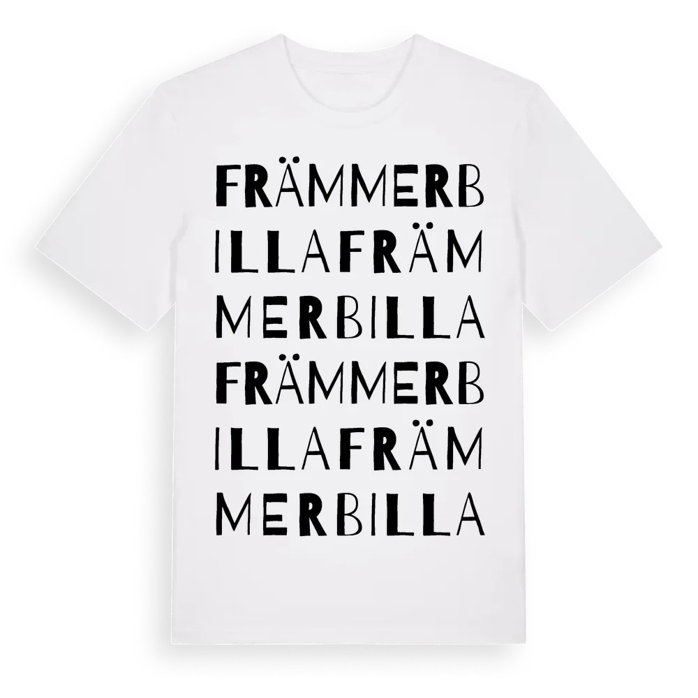 Främmerbilla ordlek t-shirt är inspirerad av byn Främmerbilla i Västernorrlands län, Sverige. Tröjan är designad för dig som har en speciell koppling till platsen – oavsett om du bor här, har rötterna här eller bara älskar Främmerbilla.