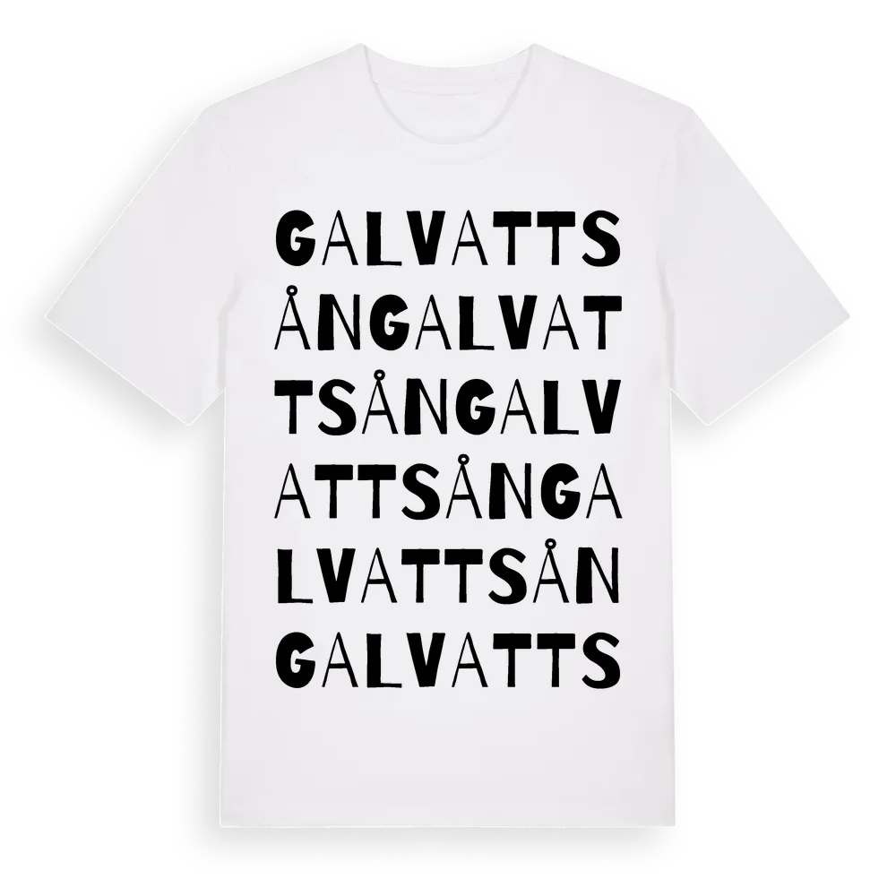 Galvattsån ordlek t-shirt är inspirerad av Galvattsån i Västernorrlands län, Sverige. Tröjan är designad för dig som har en speciell koppling till platsen – oavsett om du bor här, har rötterna här eller bara älskar Galvattsån.