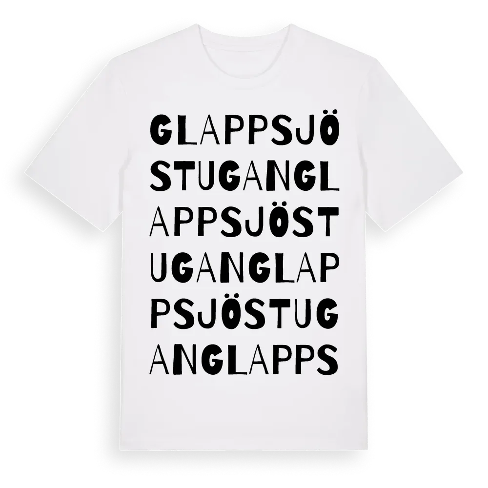 Glappsjöstugan ordlek t-shirt är inspirerad av Glappsjöstugan i Västernorrlands län, Sverige. Tröjan är designad för dig som har en speciell koppling till platsen – oavsett om du bor här, har rötterna här eller bara älskar Glappsjöstugan.