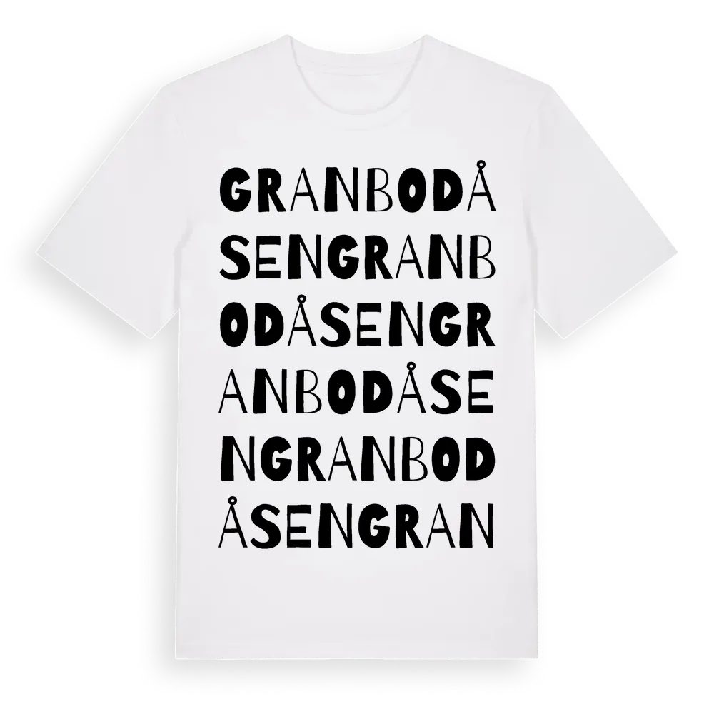 Granbodåsen ordlek t-shirt är inspirerad av Granbodåsen i Västernorrlands län, Sverige. Tröjan är designad för dig som har en speciell koppling till platsen – oavsett om du bor här, har rötterna här eller bara älskar Granbodåsen.