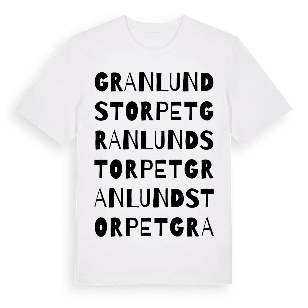 Granlundstorpet ordlek t-shirt är inspirerad av byn Granlundstorpet i Västernorrlands län, Sverige. Tröjan är designad för dig som har en speciell koppling till platsen – oavsett om du bor här, har rötterna här eller bara älskar Granlundstorpet.