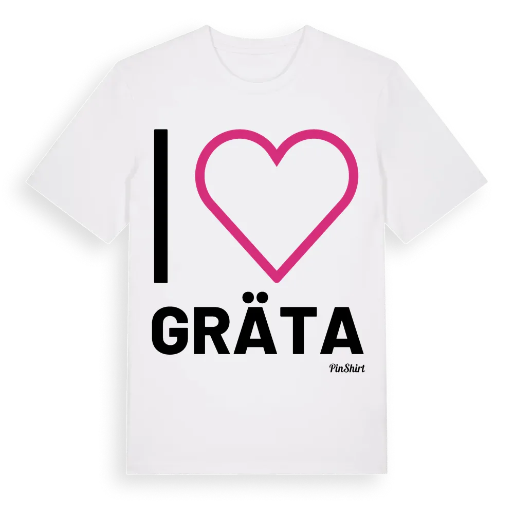 Det klassiska "I ❤ Gräta"-motivet i stort format som täcker hela bröstet. För dig som vill visa kärleken till Gräta på riktigt. Premium bomull, unisex – från byn Gräta i Västernorrlands län.