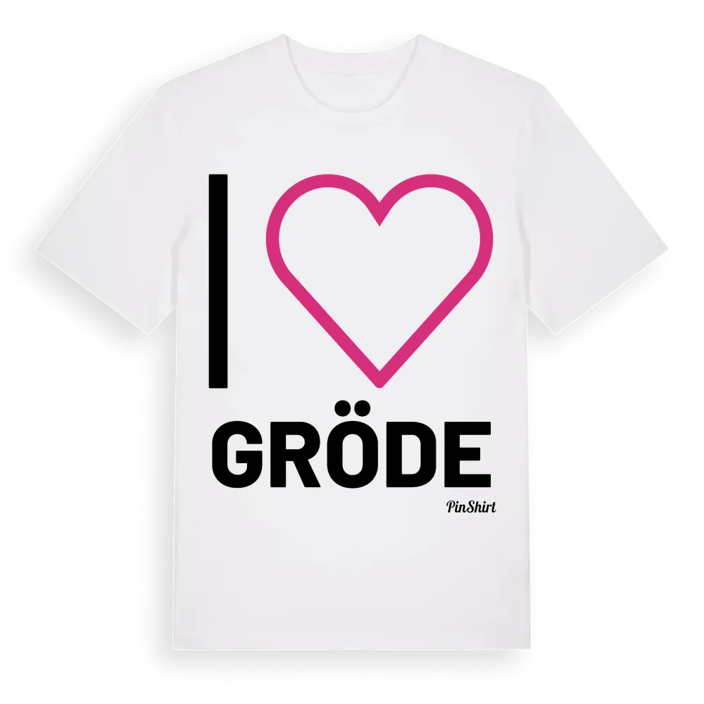 Jag älskar Gröde t-shirt stort tryck är inspirerad av byn Gröde i Västernorrlands län, Sverige. Tröjan är designad för dig som har en speciell koppling till platsen – oavsett om du bor här, har rötterna här eller bara älskar Gröde.