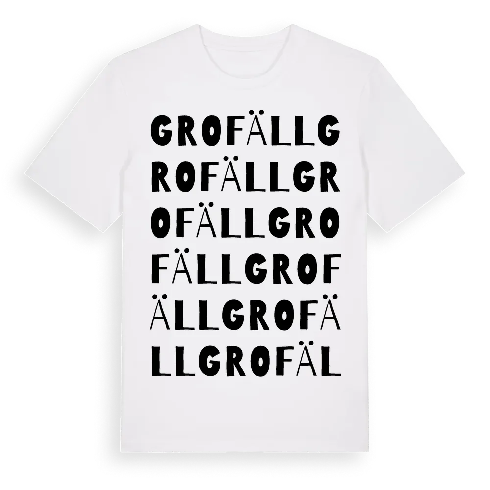 En ordlek byggd på Grofälls namn. Subtilt och klurig – ett motiv som bara de som verkligen känner platsen fullt ut förstår. Premium bomull, unisex – från byn Grofäll i Västernorrlands län.