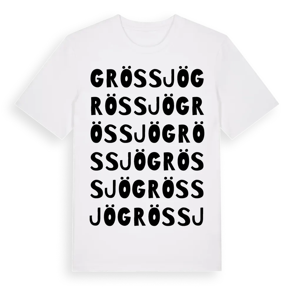 Grössjö ordlek t-shirt är inspirerad av byn Grössjö i Västernorrlands län, Sverige. Tröjan är designad för dig som har en speciell koppling till platsen – oavsett om du bor här, har rötterna här eller bara älskar Grössjö.