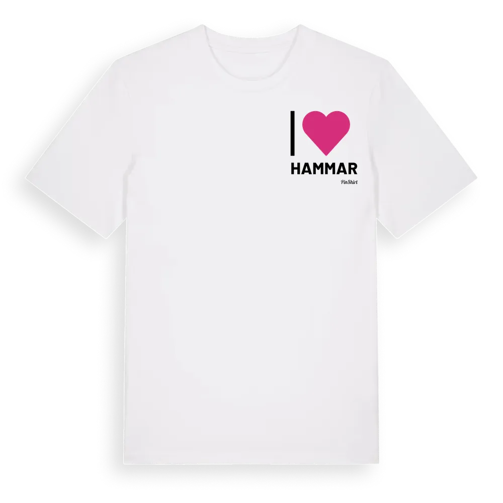 Jag älskar Hammar t-shirt litet tryck är inspirerad av byn Hammar i Västernorrlands län, Sverige. Tröjan är designad för dig som har en speciell koppling till platsen – oavsett om du bor här, har rötterna här eller bara älskar Hammar.