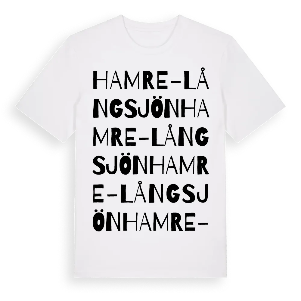 Hamre-Långsjön ordlek t-shirt är inspirerad av byn Hamre-Långsjön i Västernorrlands län, Sverige. Tröjan är designad för dig som har en speciell koppling till platsen – oavsett om du bor här, har rötterna här eller bara älskar Hamre-Långsjön.