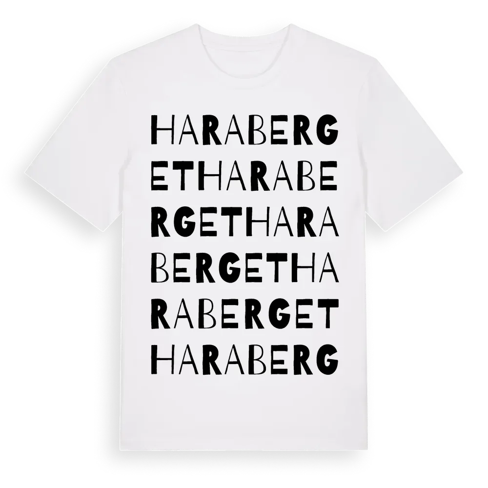 Haraberget ordlek t-shirt är inspirerad av byn Haraberget i Västernorrlands län, Sverige. Tröjan är designad för dig som har en speciell koppling till platsen – oavsett om du bor här, har rötterna här eller bara älskar Haraberget.