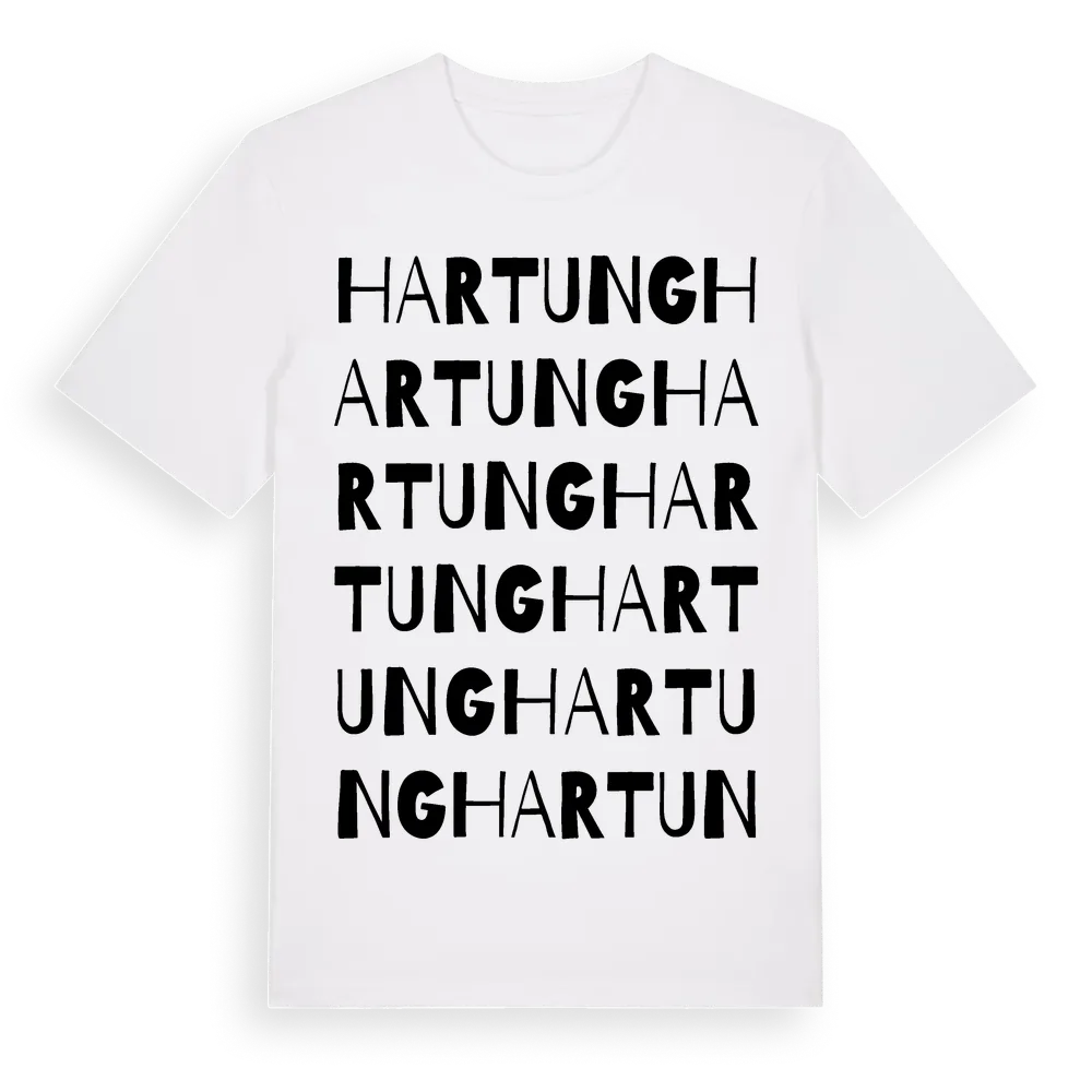 En ordlek byggd på Hartungs namn. Subtilt och klurig – ett motiv som bara de som verkligen känner platsen fullt ut förstår. Premium bomull, unisex – från byn Hartung i Västernorrlands län.
