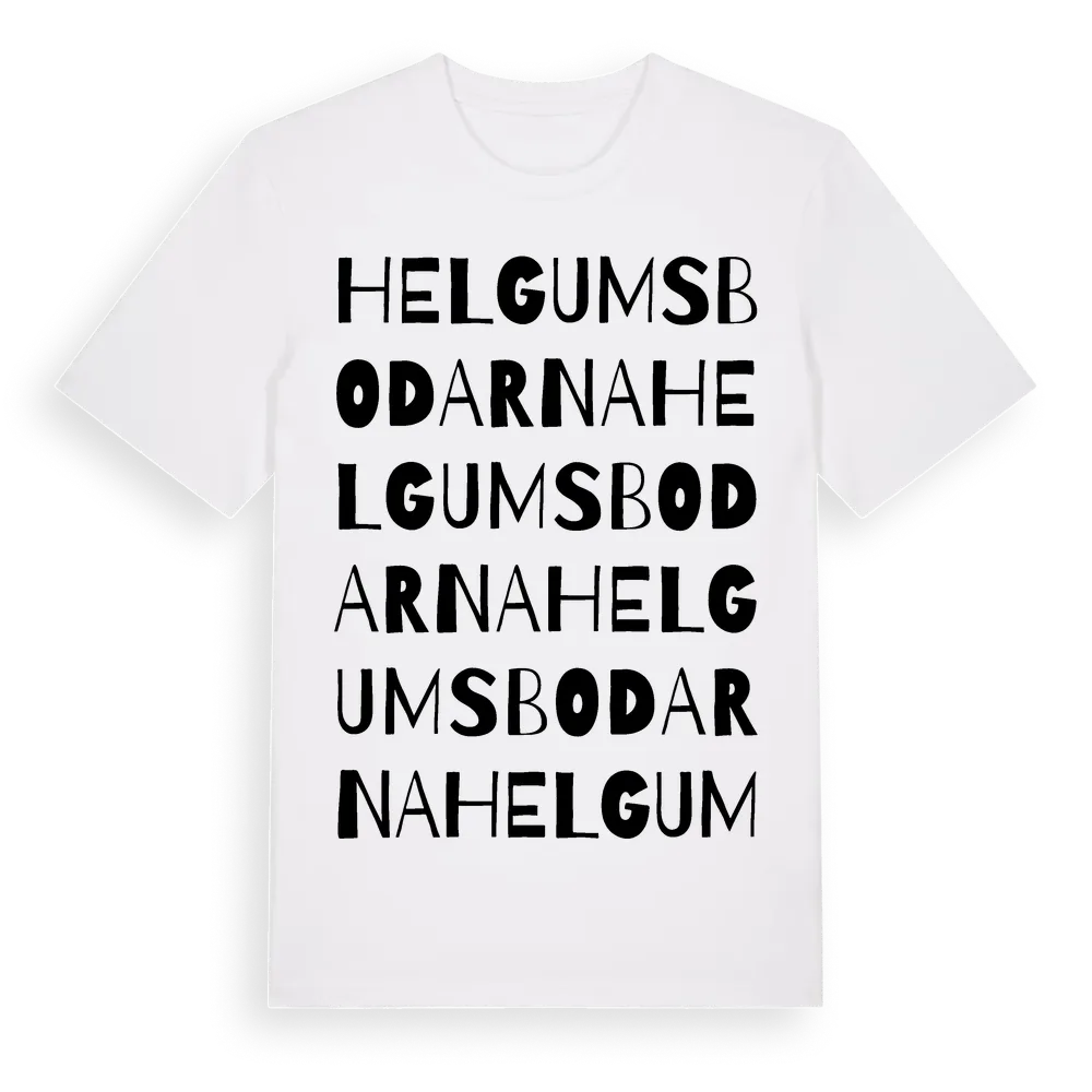 Helgumsbodarna ordlek t-shirt är inspirerad av byn Helgumsbodarna i Västernorrlands län, Sverige. Tröjan är designad för dig som har en speciell koppling till platsen – oavsett om du bor här, har rötterna här eller bara älskar Helgumsbodarna.