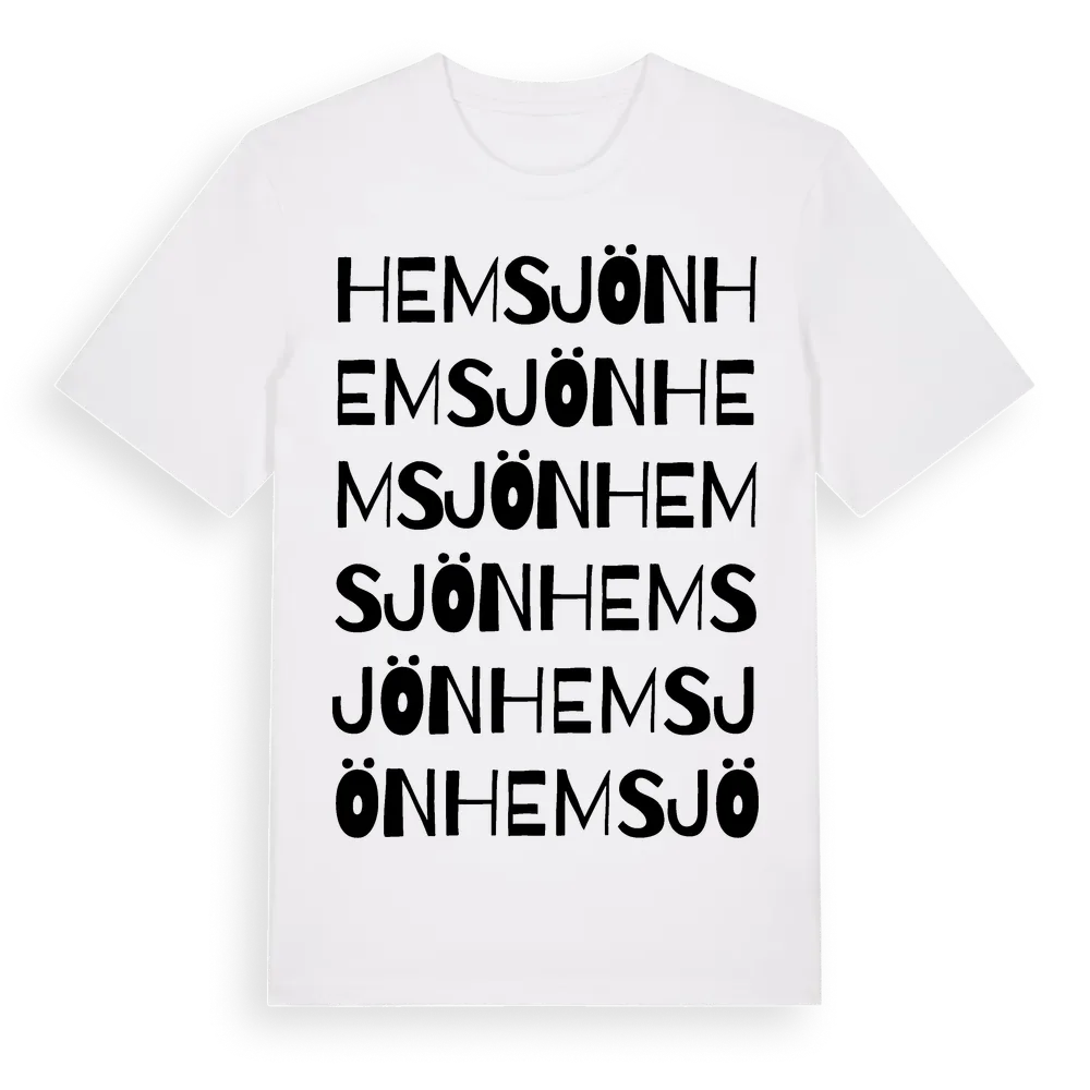 Hemsjön ordlek t-shirt är inspirerad av byn Hemsjön i Västernorrlands län, Sverige. Tröjan är designad för dig som har en speciell koppling till platsen – oavsett om du bor här, har rötterna här eller bara älskar Hemsjön.