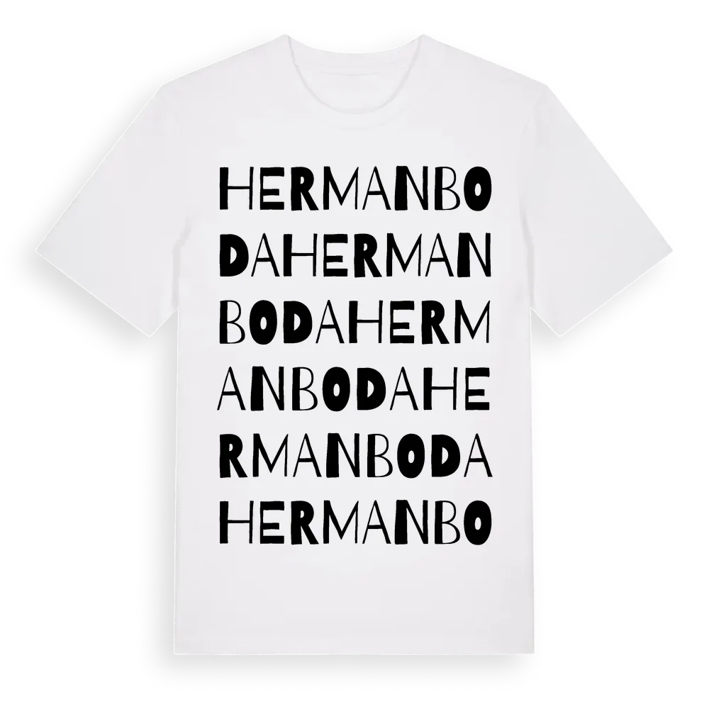 Hermanboda ordlek t-shirt är inspirerad av byn Hermanboda i Västernorrlands län, Sverige. Tröjan är designad för dig som har en speciell koppling till platsen – oavsett om du bor här, har rötterna här eller bara älskar Hermanboda.