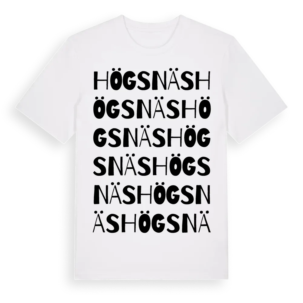 En ordlek byggd på Högsnäss namn. Subtilt och klurig – ett motiv som bara de som verkligen känner platsen fullt ut förstår. Premium bomull, unisex – från byn Högsnäs i Västernorrlands län.
