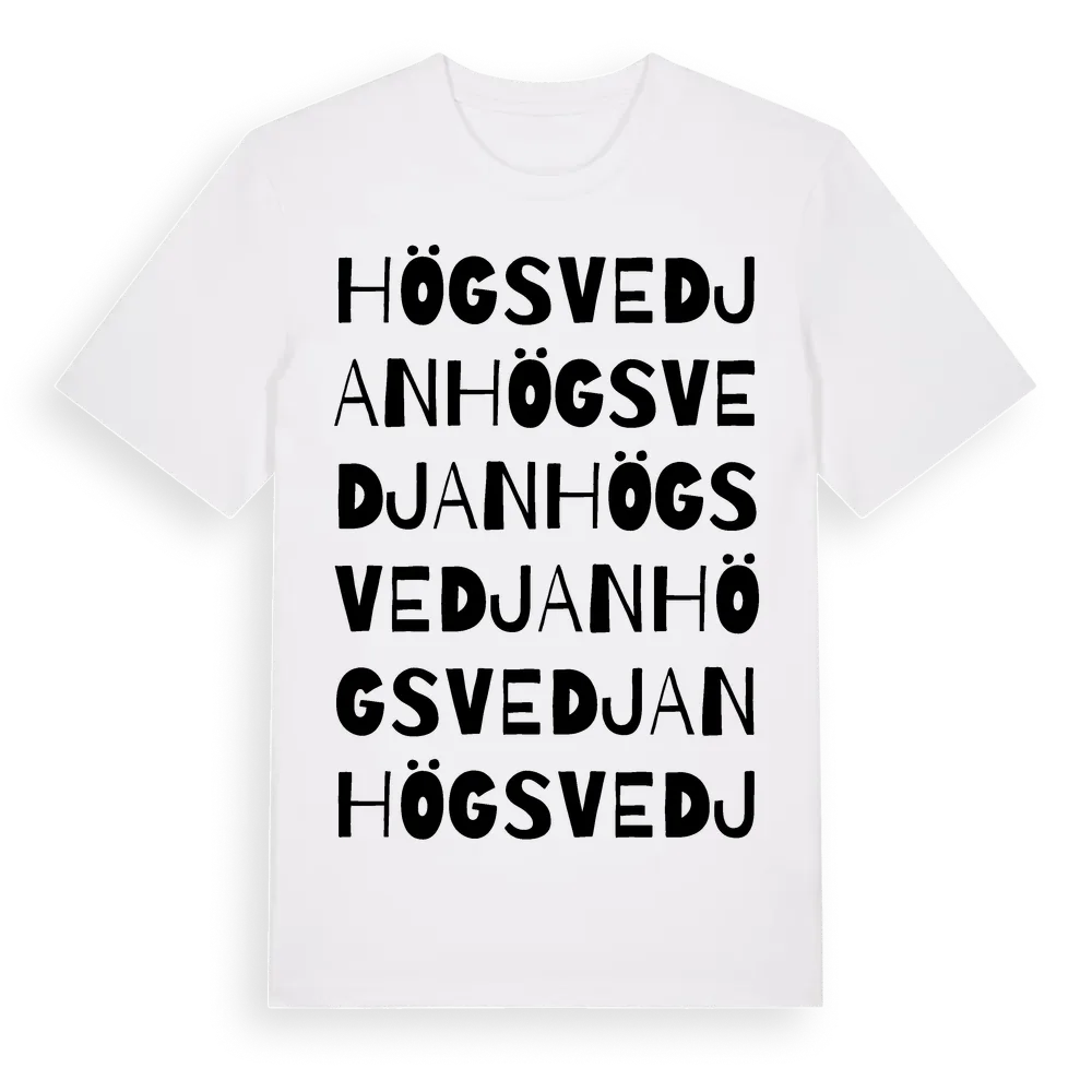 Högsvedjan ordlek t-shirt är inspirerad av Högsvedjan i Västernorrlands län, Sverige. Tröjan är designad för dig som har en speciell koppling till platsen – oavsett om du bor här, har rötterna här eller bara älskar Högsvedjan.