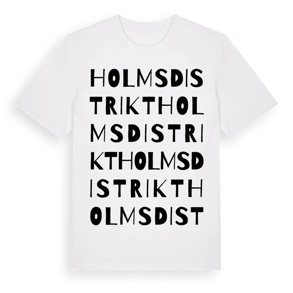 Holms Distrikt ordlek t-shirt är inspirerad av Holms Distrikt i Västernorrlands län, Sverige. Tröjan är designad för dig som har en speciell koppling till platsen – oavsett om du bor här, har rötterna här eller bara älskar Holms Distrikt.