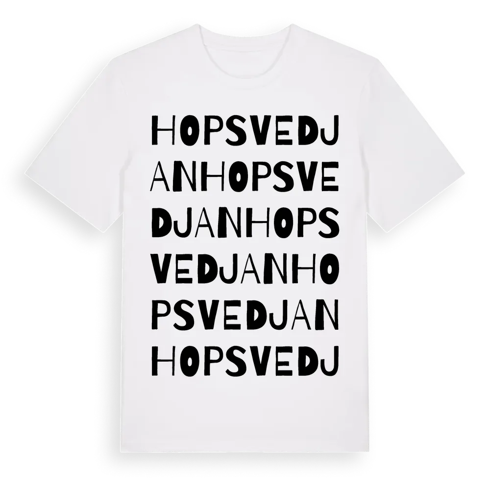 Hopsvedjan ordlek t-shirt är inspirerad av Hopsvedjan i Västernorrlands län, Sverige. Tröjan är designad för dig som har en speciell koppling till platsen – oavsett om du bor här, har rötterna här eller bara älskar Hopsvedjan.