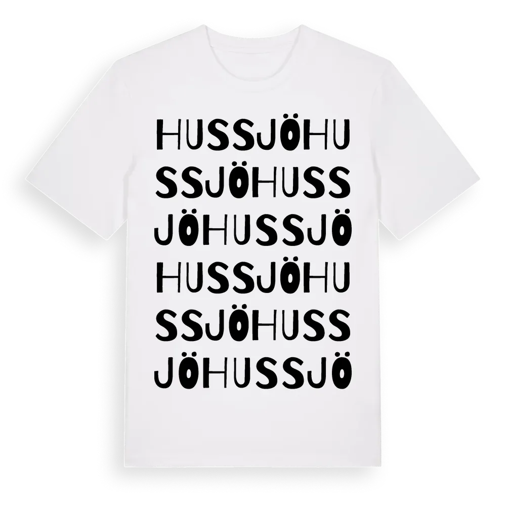 Hussjö ordlek t-shirt är inspirerad av byn Hussjö i Västernorrlands län, Sverige. Tröjan är designad för dig som har en speciell koppling till platsen – oavsett om du bor här, har rötterna här eller bara älskar Hussjö.