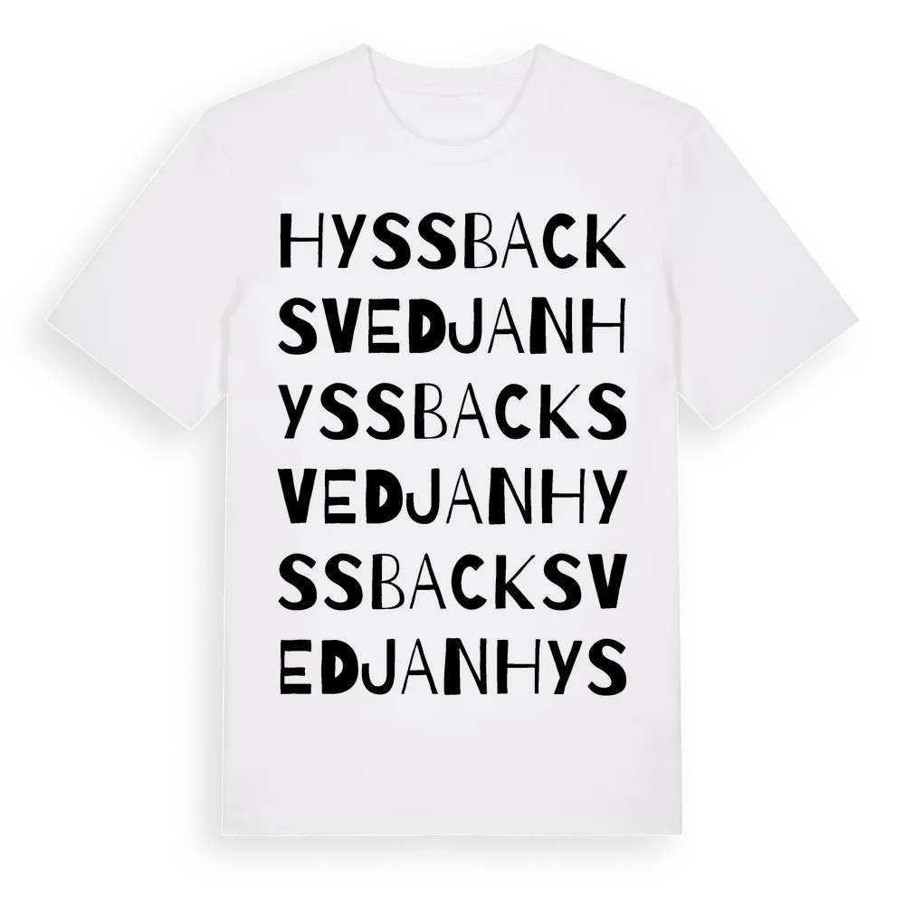 Hyssbacksvedjan ordlek t-shirt är inspirerad av Hyssbacksvedjan i Västernorrlands län, Sverige. Tröjan är designad för dig som har en speciell koppling till platsen – oavsett om du bor här, har rötterna här eller bara älskar Hyssbacksvedjan.