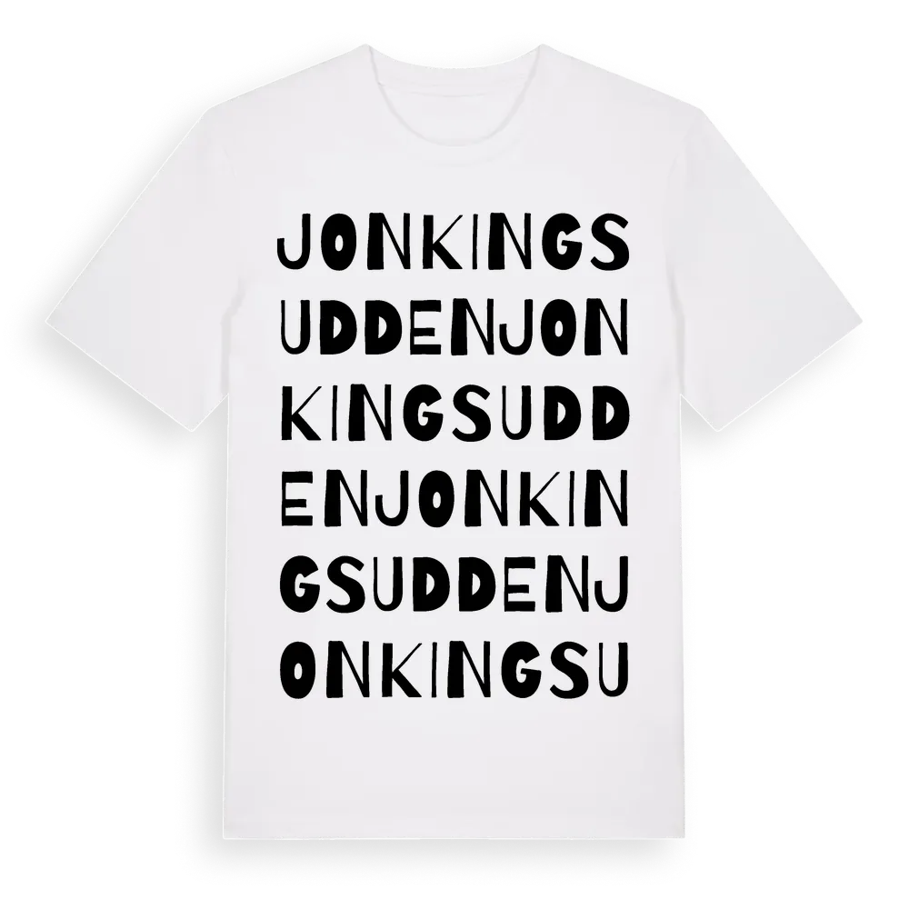 Jonkingsudden ordlek t-shirt är inspirerad av Jonkingsudden i Västernorrlands län, Sverige. Tröjan är designad för dig som har en speciell koppling till platsen – oavsett om du bor här, har rötterna här eller bara älskar Jonkingsudden.