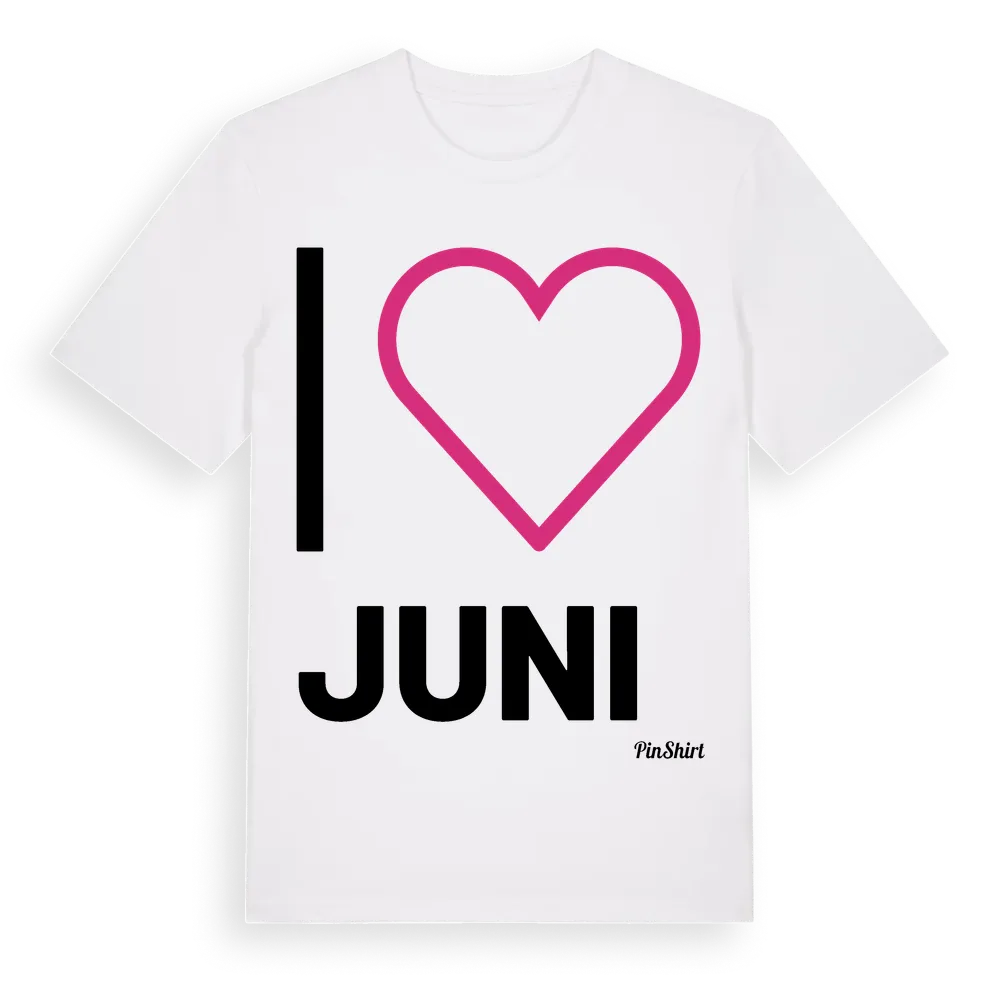 Det klassiska "I ❤ Juni"-motivet i stort format som täcker hela bröstet. För dig som vill visa kärleken till Juni på riktigt. Premium bomull, unisex – från byn Juni i Västernorrlands län.