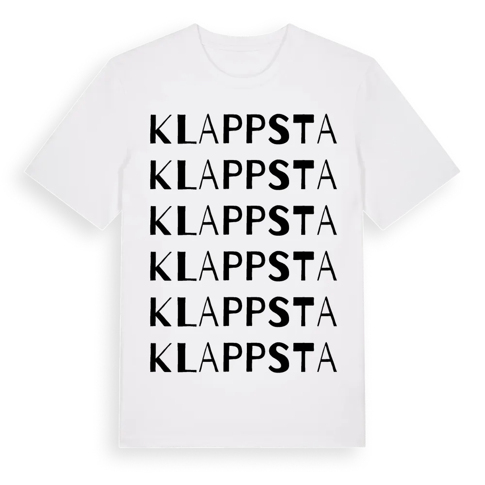 Klappsta ordlek t-shirt är inspirerad av byn Klappsta i Västernorrlands län, Sverige. Tröjan är designad för dig som har en speciell koppling till platsen – oavsett om du bor här, har rötterna här eller bara älskar Klappsta.