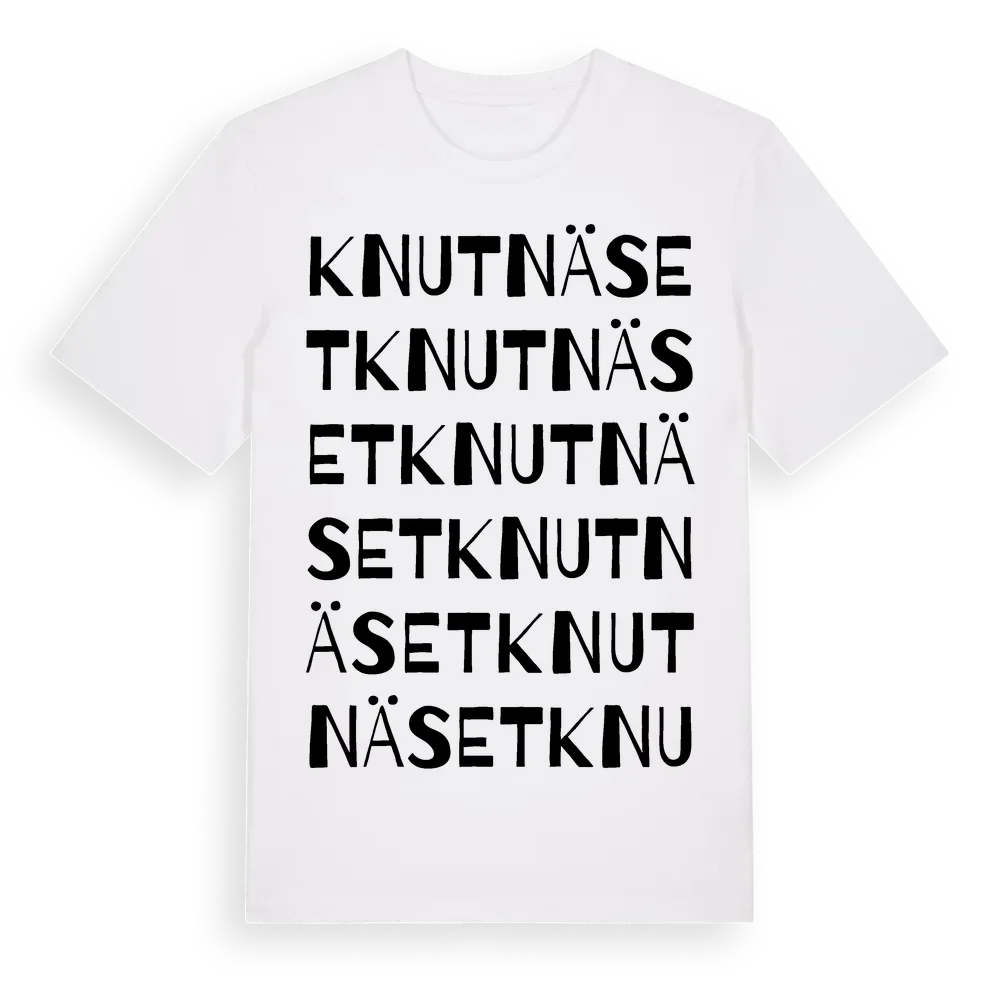 Knutnäset ordlek t-shirt är inspirerad av byn Knutnäset i Västernorrlands län, Sverige. Tröjan är designad för dig som har en speciell koppling till platsen – oavsett om du bor här, har rötterna här eller bara älskar Knutnäset.