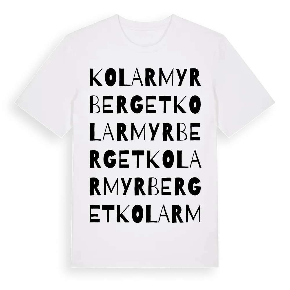 Kolarmyrberget ordlek t-shirt är inspirerad av Kolarmyrberget i Västernorrlands län, Sverige. Tröjan är designad för dig som har en speciell koppling till platsen – oavsett om du bor här, har rötterna här eller bara älskar Kolarmyrberget.