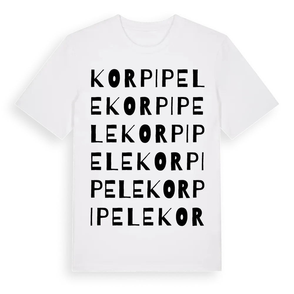 Korpipele ordlek t-shirt är inspirerad av Korpipele i Västernorrlands län, Sverige. Tröjan är designad för dig som har en speciell koppling till platsen – oavsett om du bor här, har rötterna här eller bara älskar Korpipele.