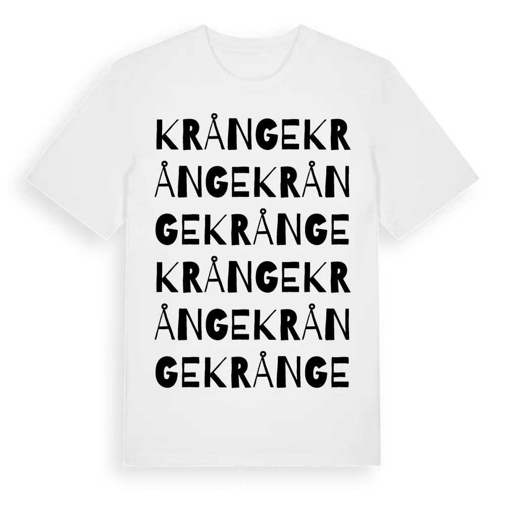 Krånge ordlek t-shirt är inspirerad av byn Krånge i Västernorrlands län, Sverige. Tröjan är designad för dig som har en speciell koppling till platsen – oavsett om du bor här, har rötterna här eller bara älskar Krånge.