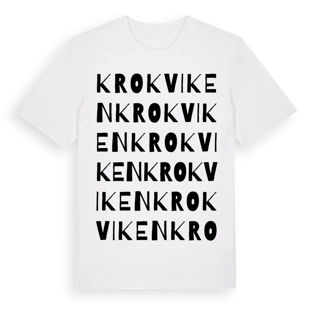 Krokviken ordlek t-shirt är inspirerad av byn Krokviken i Västernorrlands län, Sverige. Tröjan är designad för dig som har en speciell koppling till platsen – oavsett om du bor här, har rötterna här eller bara älskar Krokviken.