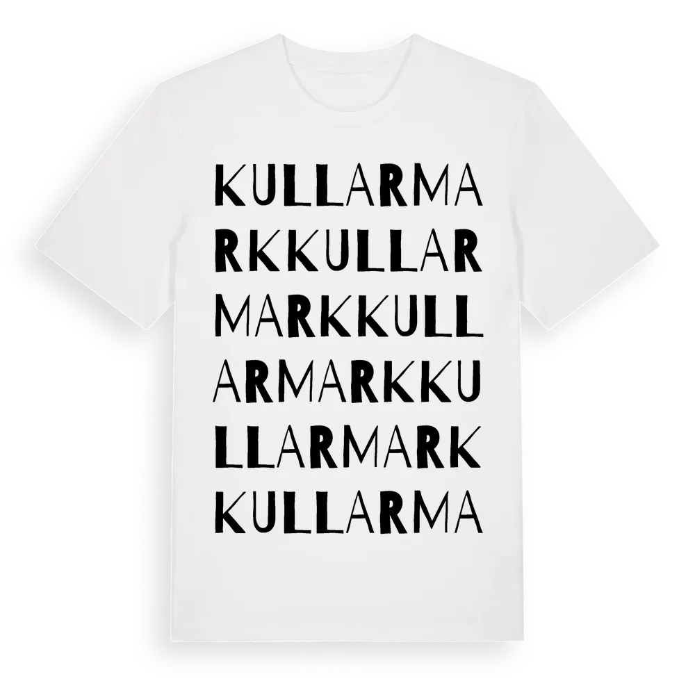 Kullarmark ordlek t-shirt är inspirerad av byn Kullarmark i Västernorrlands län, Sverige. Tröjan är designad för dig som har en speciell koppling till platsen – oavsett om du bor här, har rötterna här eller bara älskar Kullarmark.