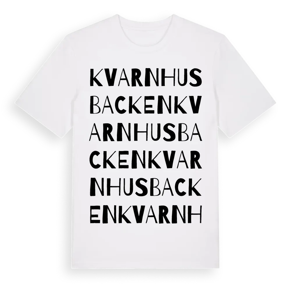 Kvarnhusbacken ordlek t-shirt är inspirerad av byn Kvarnhusbacken i Västernorrlands län, Sverige. Tröjan är designad för dig som har en speciell koppling till platsen – oavsett om du bor här, har rötterna här eller bara älskar Kvarnhusbacken.